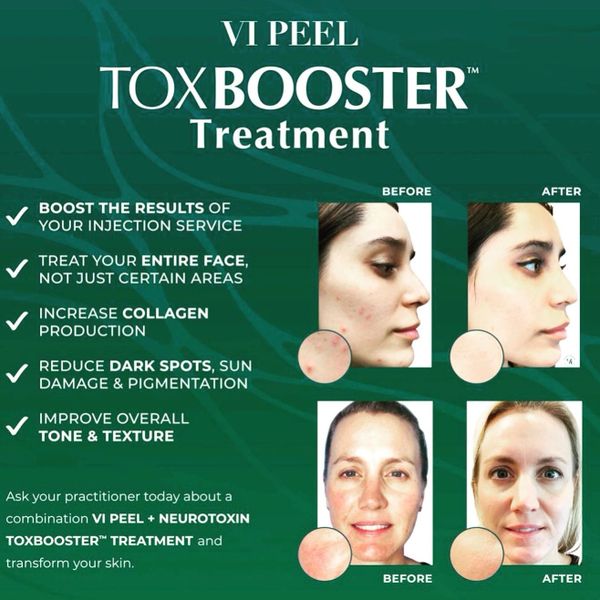 Lines and wrinkles have you frustrated? A VI Peel ToxBooster treats the epidermis, dermis and muscular layer all in one treatment. As the peel process begins, neuromodulator effects are hard at work, under the surface. Not only will you see smoother, tighter skin, but treated areas will display softer lines and expressions at day 14!